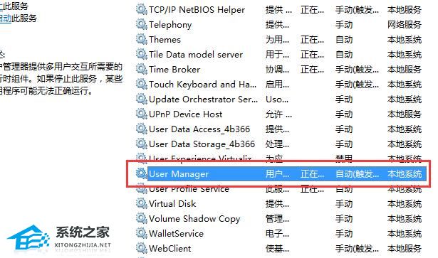 4、接着我们在服务菜单中,找到【USER Manager】服务,查看运行状态是否被禁用。