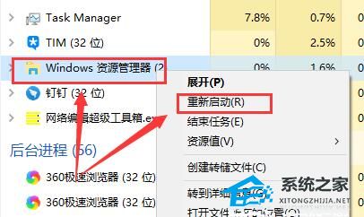 3、然后在任务管理器中找到【Windows资源管理器】,鼠标右键选择【重新启动】。