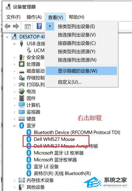 2、设备管理器窗口,点击顶部查看选项,在打开的下拉项中,选择显示隐藏的设备。然后点击展开蓝牙,找到并选择需要删除的设备,点击右键,在打开的菜单项中,选择卸载。