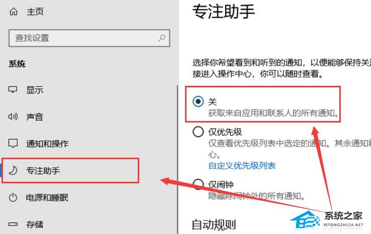 3、然后切换到【专注助手】的选项中,将其【关】闭。就解决了。