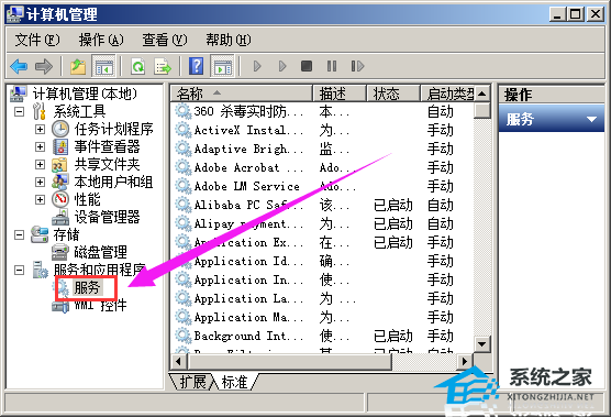 2、然后在打开的计算机管理窗口里面,点击服务和应用程序下面的“服务”选项。