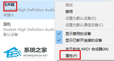 2、进入界面后,我们选择我们的扬声器,或者耳机设备也行,双击打开,或者鼠标右键“扬声器”,选择“属性”。