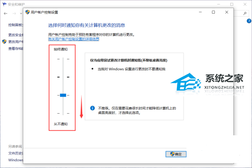 4、打开,将左边滚轮拖到最下面“从来不通告”再“确定”保存就可以处理。