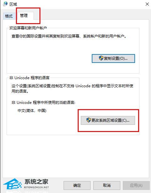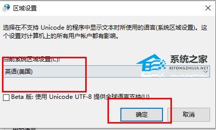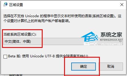 5、再次打开“更改系统区域设置”,将语言设置回“中文”即可。