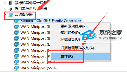 3、之后去点击“网络适配器”,找到以下程序,右击“属性”。