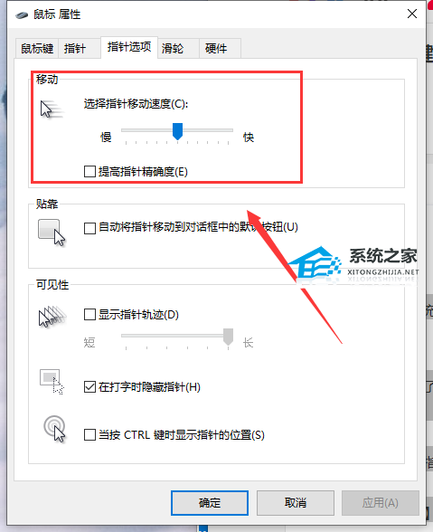 3、然后点击指针选项,可以设置鼠标指针移动速度快慢,以及鼠标可见性。