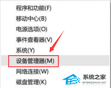 3、在开始菜单按钮上单击鼠标右键,在弹出的菜单中点击“设备管理器”。