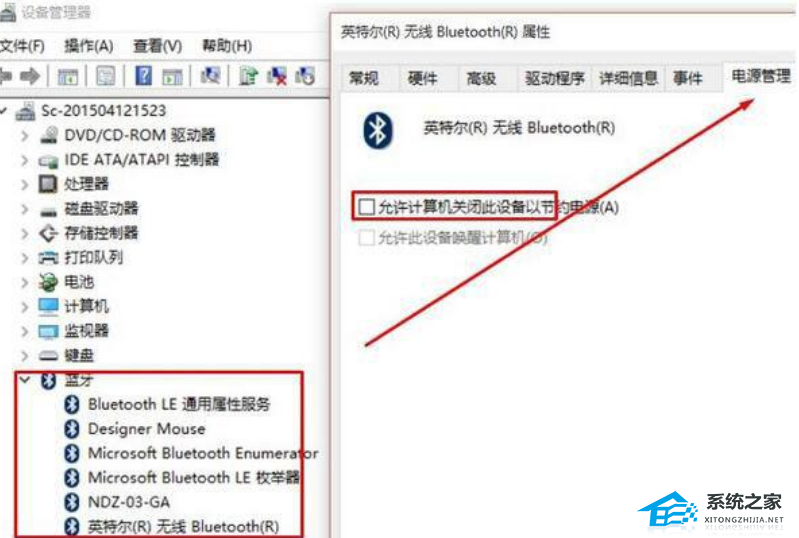 4、在设备管理器中双击蓝牙图标展开子目录。双击打开每一个子项,如果新出现的对话框中有“电源管理”的选项卡,就反选“允许计算机关闭此设备以节约电源”的选项,再点击确定。