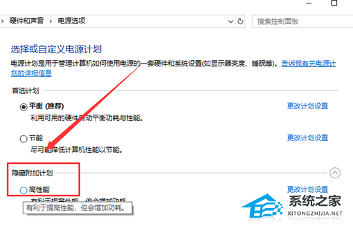 3、找到“隐藏附加计划”点开,然后选择“高性能”计划即可!