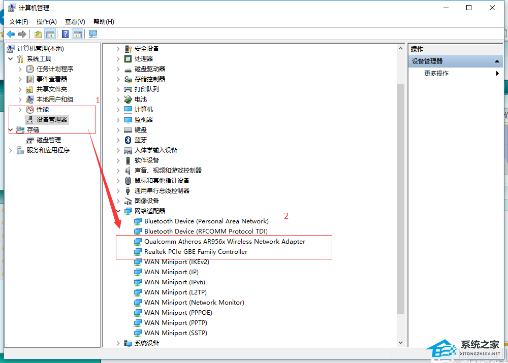 3、找到网络适配器一项,展开折叠菜单后,找到网卡的驱动并鼠标右键选择【属性】。