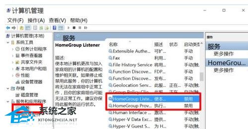 2、左侧的菜单选择服务——在右侧找到“HomeGroup Listener”和“HomeGroup Provider”两个服务。