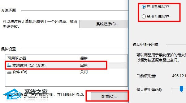 2、配置系统保护功能,选择禁用。(有开启的话)
