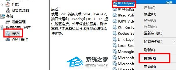 1、右键点击此电脑——选择管理——在左侧菜单选择服务——右侧找到IPHelper——右击选择属性。
