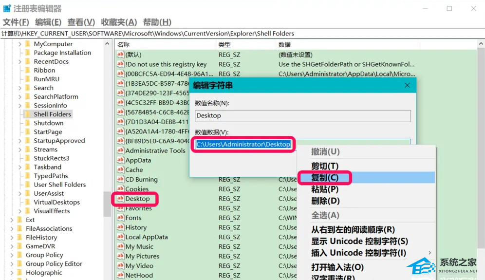 4、编辑字符串窗口中,右键点击【Desktop】数值数据,在右键菜单中点击复制,将【C:\Users\Administrator\Desktop】复制到记事本中。