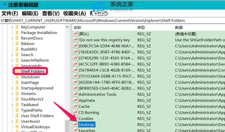3、定位到【Shell Folders】,在对应的右侧窗口中找到并双击【Desktop】。
