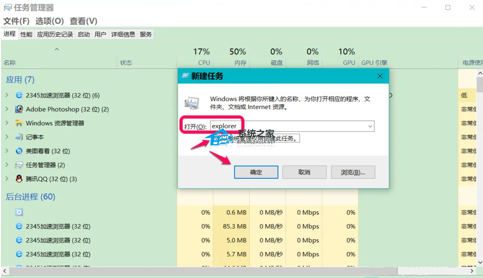按键盘上的【 Ctrl + Alt + Del 】组合键,进入系统注销界面,点击【任务管理器】。打开的任务管理器窗口中,点击左上角的【文件】,在打开的下拉项中,选择【运行新任务】,新建任务窗口,输入【explorer】命令,同时勾选【以系统管理权限创建此任务】,最后点击【确定】即可。