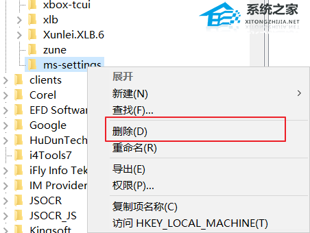 6、 找到列表中的ms-settings点击鼠标右键,选择删除即可。