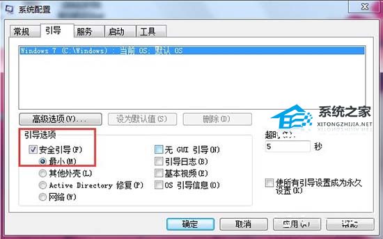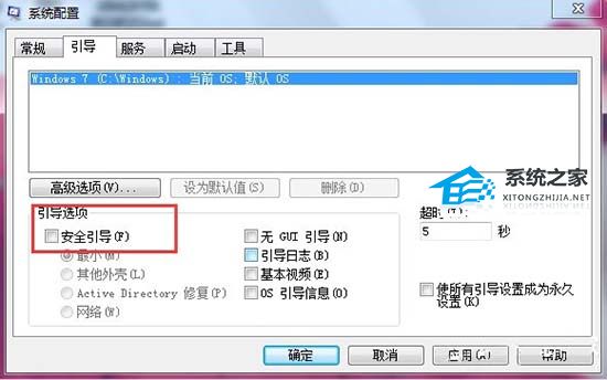 4. 待完成有关“安全模式”下的相关操作之后,我们还需要在“安全模式”界面中清除“安全引导”选项,以实现正常启动Windows操作系统功能。