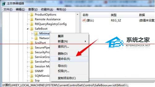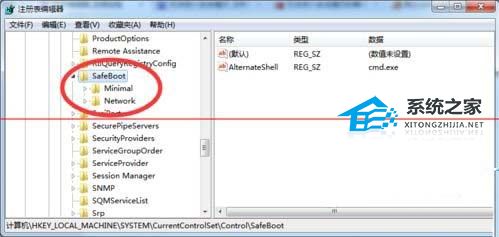 2. 从打开的“注册表编辑器”界面中,依次进入“HKEY_LOCAL_MACHINE\SYSTEM\CurrentControlSet\Control\SafeBoot”,在此可以看到“Minimal”及 “Network”项。