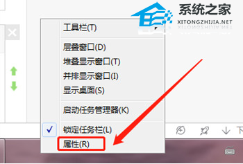 2、在电脑桌面下方的任务栏空白处,单击鼠标右键,会出现如下窗口,在窗口中找到“属性”并打开。