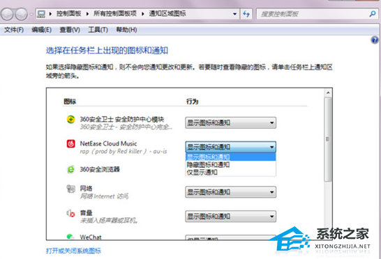 4、找到要隐藏图标的软件行为下设置为“隐藏图标和通知”。
