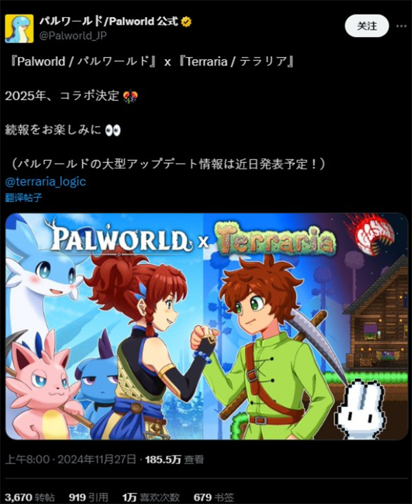 游戏开发商PocketPair于2024年11月27日宣布,旗下的开放世界冒险游戏《幻兽帕鲁》将与著名沙盒游戏《泰拉瑞亚》展开合作,双方计划于2025年推出联动内容。