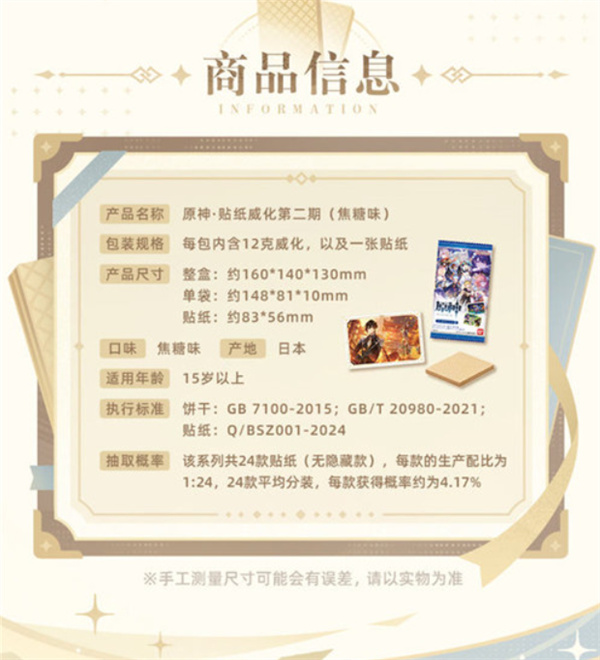 米哈游宣布,《原神》全新周边产品“贴纸威化(焦糖味)”将于7月16日20:00正式上线原神官方店铺。每包内含一份焦糖味威化(12克)与一张随机角色贴纸,究竟你会抽到哪位提瓦特伙伴呢,祝你们幸运连连,抽到自己想要的角色。