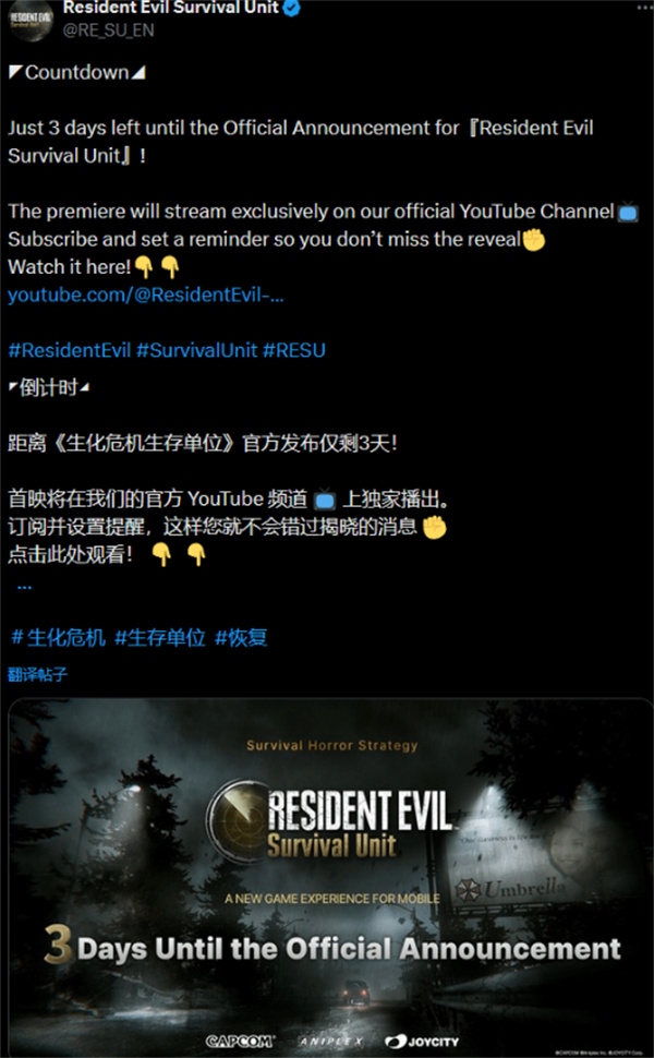 由 Aniplex 联手 JOYCITY,并与卡普空深度合作打造的全新手游新作《Resident Evil: Survival Unit》(暂译:《生化危机:生存兵种》),将于7月11日通过油管发布会正式揭开神秘面纱。