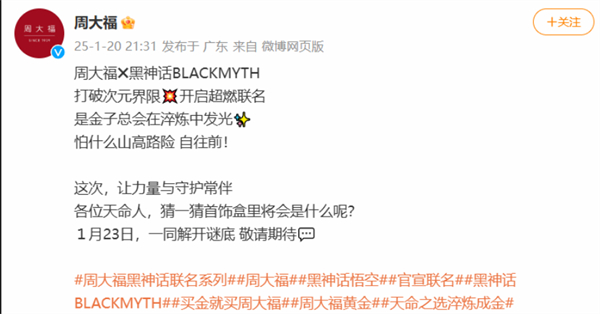 该联动更多消息预计将于1月23日正式揭晓,玩家们可以期待更多与《黑神话:悟空》相关的精美周边产品,进一步加深游戏的文化影响力并增强玩家的参与感。