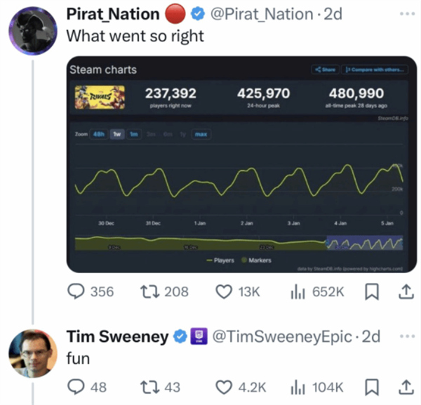 Epic Games的Tim Sweeney在回应一位推主时表示,这款游戏的成功秘诀就是:“好玩”。这一简洁而直接的回答也引起了广大网友的共鸣,很多人认为,正是这种“好玩”让《漫威争锋》在竞争激烈的市场中脱颖而出。