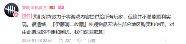 "由于无法顺利将游戏内容提供给所有玩家,'伊藤润二收藏'外观物品无法在部分地区购买和使用,我们对国区玩家表示歉意。"