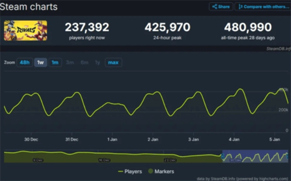 根据SteamDB数据显示,《漫威争锋》在Steam的在线峰值达到了42.6万人,接近历史最高峰值48万人,反映出其极高的玩家活跃度和受欢迎程度。对此,《漫威争锋》的官方在推特上发布感谢声明,表示他们非常高兴看到游戏发布一个月后仍然有90%的玩家继续参与游戏。