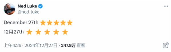 在这种背景下,《GTA》演员也对此发表了看法。《三男一狗》中的麦克演员在社交媒体上发布了一条推文,写道:“12月27日”,并配上了《GTA》的五星通缉标志。这条推文引发了大量关注,截至发稿前,已获得超过247.8万次查看。